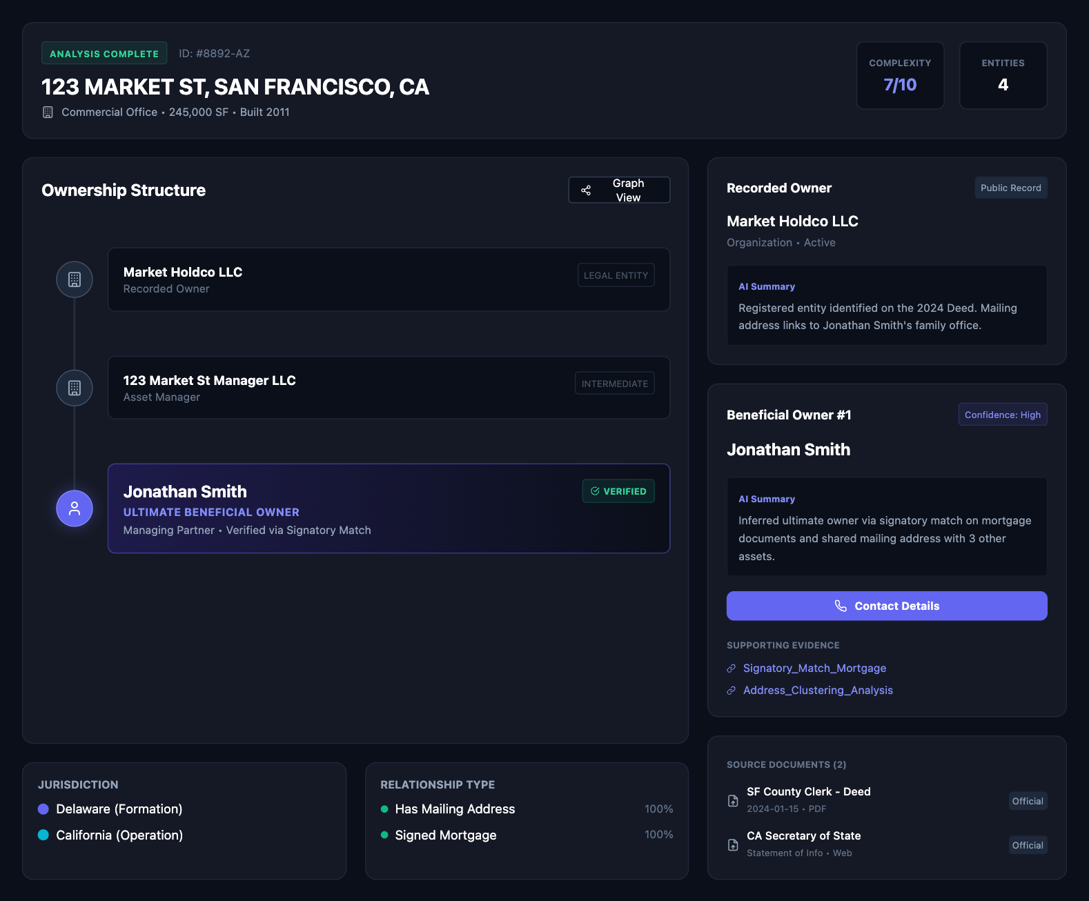 Don't learn a query language. Just ask. "Who owns 123 Market Street?" Receive a clear, cited ownership memo backed by current public records.